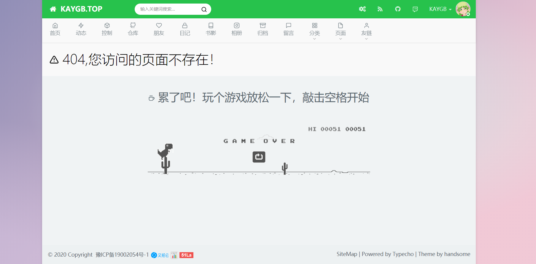 我把修改的源文件放出来,需要的自行下载就可以了,这个小游戏的源码还是很久之前在某个博主那里看到的,本人记忆力差,忘记了,望体谅!评论一下就可以看到源码了,然后直接替换原本的404.php就可以了,念旧的可以备份一下。